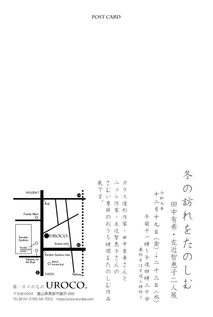 冬の訪れをたのしむ 田中有希・左近智恵子二人展 投稿者:Seaside people 投稿公開日:2025年12月8日 投稿カテゴリー:お知らせ 冬の訪れをたのしむ 田中有希・左近智恵子二人展 令和7年 12月19日〈金〉→ 23日〈水〉午前11時〜午後4時30分 ※最終日23日は午後3時終了 ガラス造形作家・田中有希さんとニット作家・左近智恵子さんのさむい季節のおうち時間をたのしむ作品展です。 器・日々のもの UROCO. 2F〒938-0004 富山県黒部市飯沢688 TEL&FAX 0765-56-7003 Please Share This Share this content Opens in a new window Opens in a new window Opens in a new window Opens in a new window Opens in a new window Opens in a new window Opens in a new window Opens in a new window Opens in a new window Opens in a new window おすすめ 送料改定のお知らせ 2024.06〜 2024年6月1日 初冬の手しごと展 2023年11月6日 ホームページを再開いたしました。 2023年2月3日