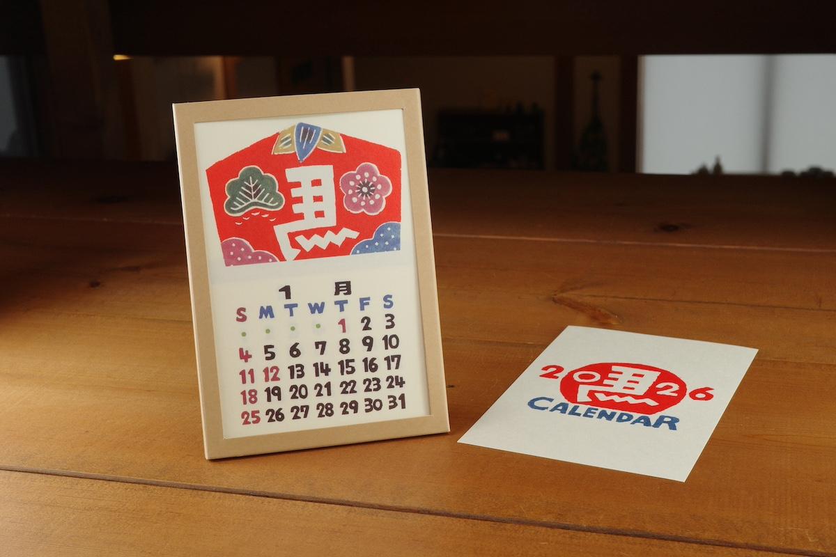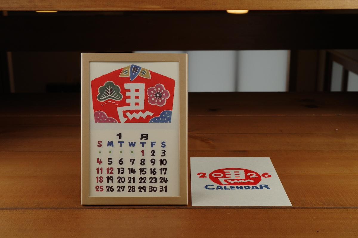 小田中耕一氏の型染をデザインに用いた卓上型(紙製ハードケース、封筒入り)の2026年版カレンダー(午年)。